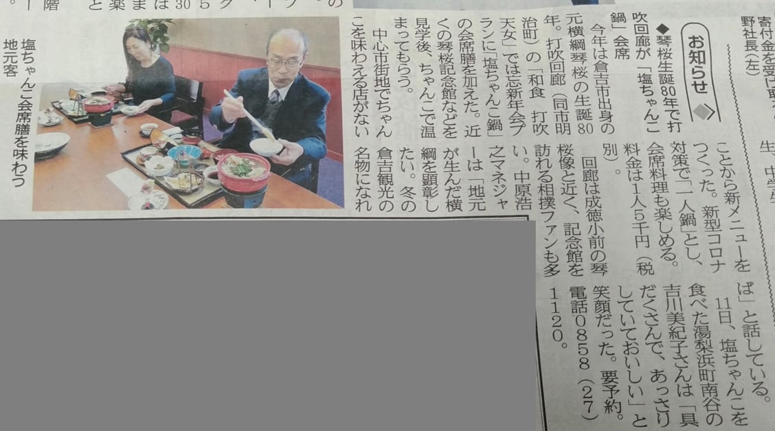 日本海新聞様の12月15日記事に、2F和食「打吹天女」の「塩ちゃんこ鍋会席膳」の記事が掲載されました。